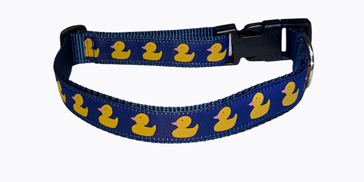All collars made in the USA with with durable quick release snaps and solid nickel plated D rings and the trims are sewn onto nylon webbing. The collars are all adjustable and machine washable.